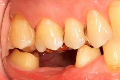 Figure 1: Initial situation: Insufficient full-cast metal crowns at teeth 26 and 27; insufficient composite filling at teeth 23, 24 and 25.